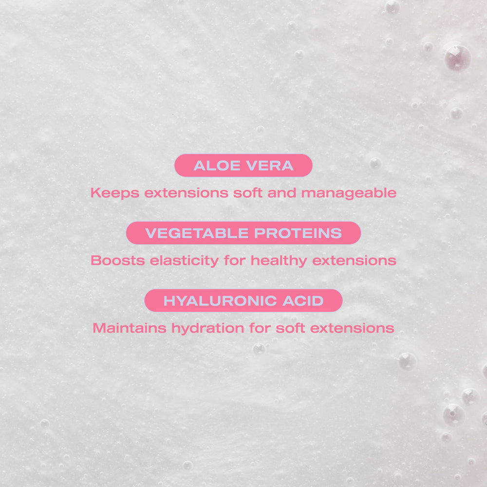 - Hyaluronic Acid deeply moisturises, locking in hydration to maintain softness and prevent dryness, leaving extensions looking fresh and vibrant.