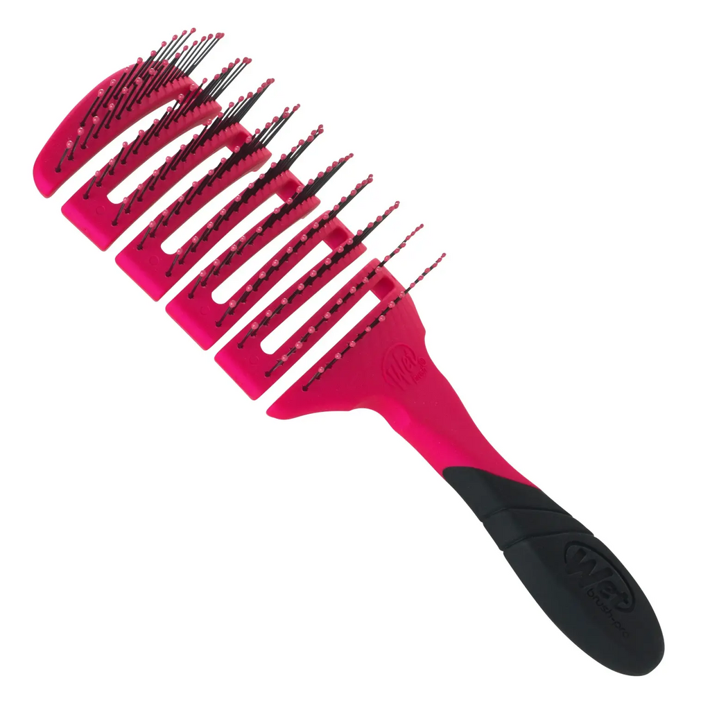 Stylists’ fave way to faster hair drying. WetBrush Pro Flex Dry Paddle Detangler in Pink features a flexible vented paddle design to speed up dry time, while contouring to the scalp for comfort. HeatFlex bristles are heat resistant and safe to use with a blow-dryer. OmniFlex brush head flexes in every direction to contour to scalp. This hair brush as a 20% larger surface area for faster styling.